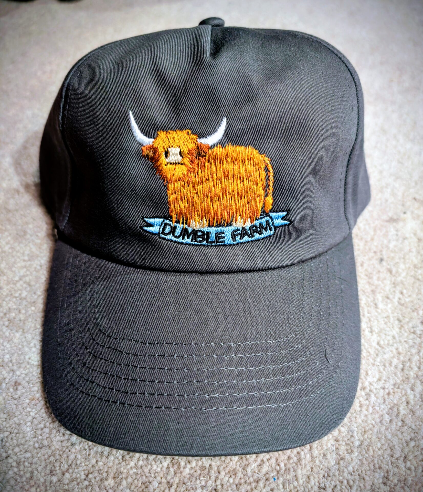 Our graphite grey caps have an embroidered Dumble Farm logo on the front with an adjustable buckle at the back.