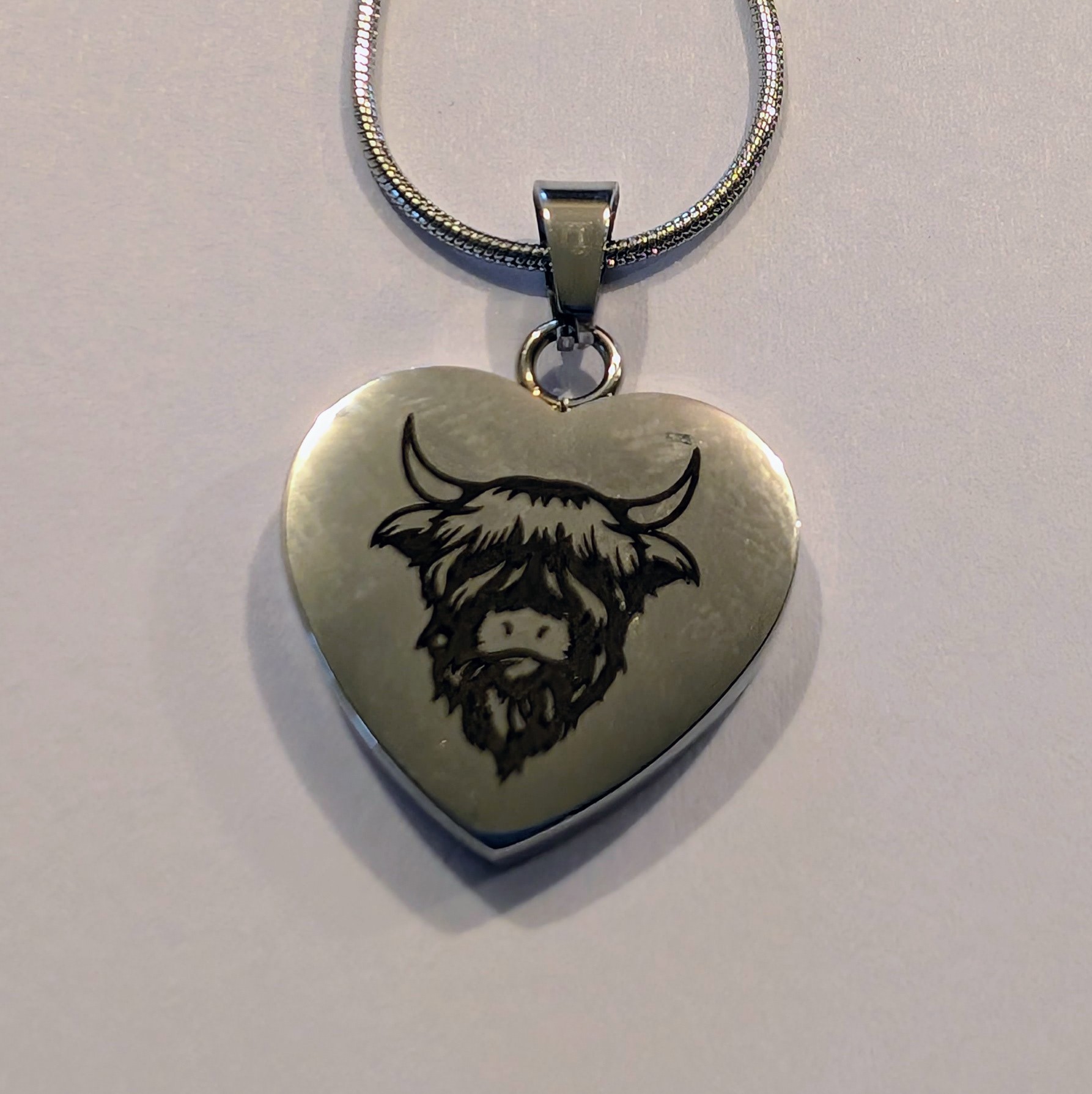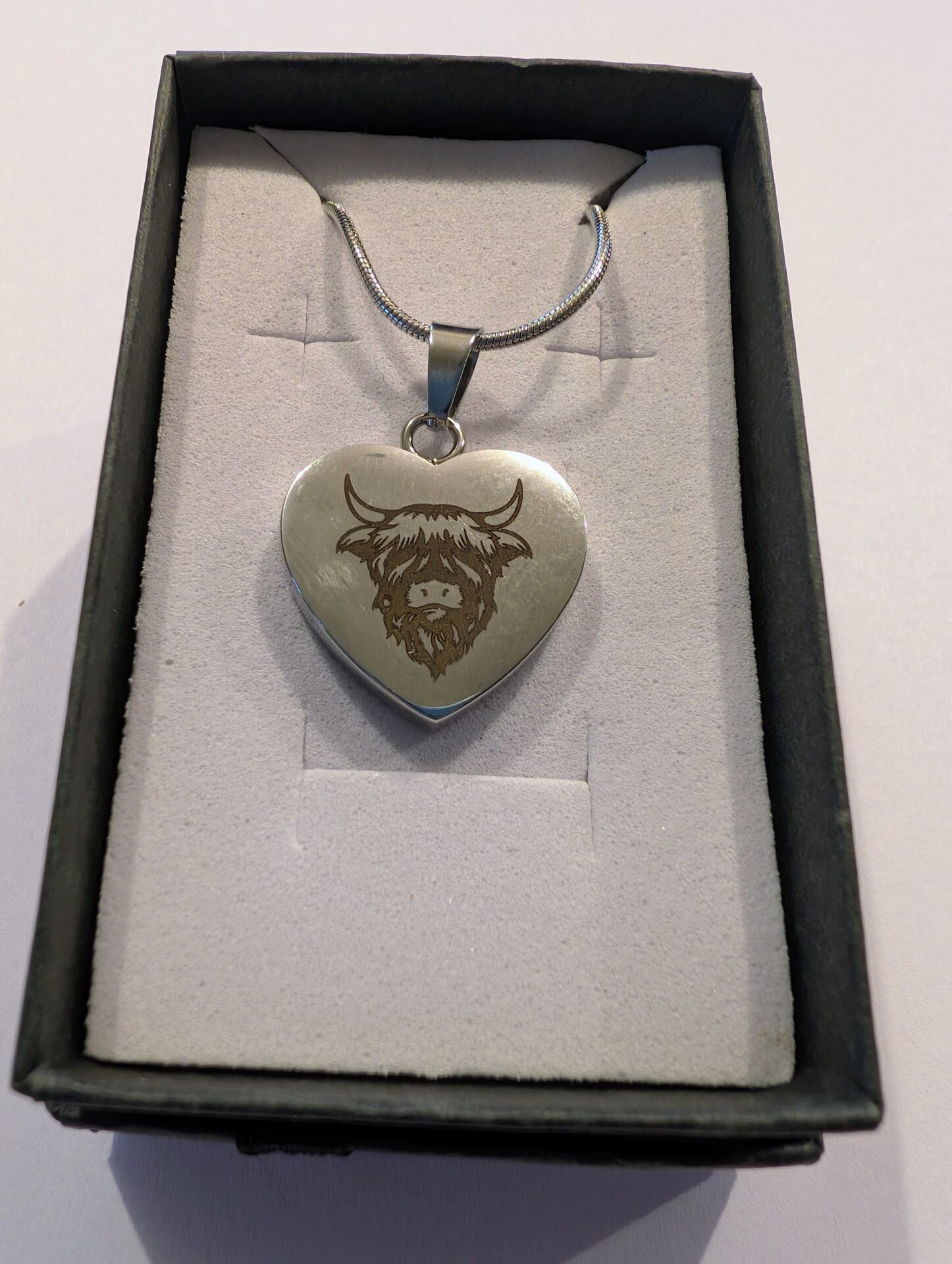 This gorgeous locally etched heart shaped necklace, features an image of a highland cow on one side with Dumble farm on the other and is supplied in a gift box.